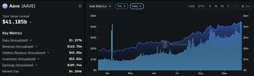 Aave menunjukkan performa fundamental yang solid terlepas dari koreksi harga token AAVE yang terjadi saat ini. Tidak hanya TVL Aave yang mampu mempertahankan level $40 miliar, namun pendapatan platform DeFi tersebut juga melonjak tajam hampir menyentuh $25 juta dalam satu pekan terakhir (periode 15-21 September). Angka tersebut sekaligus menjadi angka pendapatan mingguan tertinggi kedua sepanjang masa Aave, yang menandakan meningkatnya kegunaan dan relevansi produk di tengah dinamika pasar crypto saat ini. Berlanjutnya tren ini berpotensi meningkatkan perhatian investor terhadap token AAVE sebagai aset strategis di platform DeFi lending tersebut.