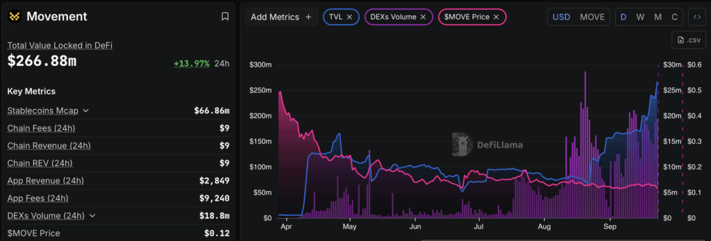 MOVE menunjukkan potensi bullish yang dapat mengakhiri tren bearishnya sejak Januari lalu seiring dengan meningkatnya adopsi blockchain Movement. Peningkatan adopsi tersebut turut diindikasikan oleh meningkatnya TVL jaringan mencetak angka tertinggi baru melampaui $266 juta. Selain itu, volume perdagangan aset crypto di exchange terdesentralisasi (DEX) di ekosistem Movement turut mengalami peningkatan yang cukup stabil dalam beberapa pekan terakhir. Berlanjutnya tren positif ini dapat berpotensi memberikan dampak positif bagi token MOVE sebagai token native jaringan.