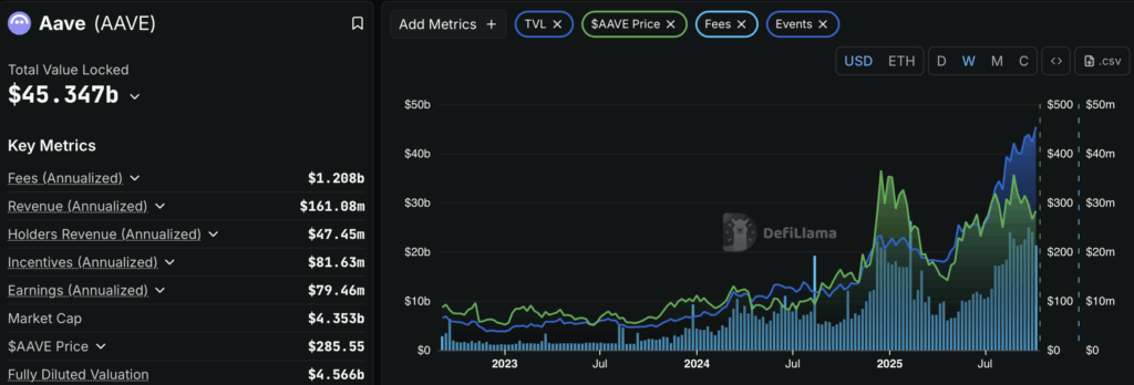 AAVE menunjukkan potensi recovery harga yang cukup menjanjikan pasca koreksi yang terjadi sejak 24 Agustus lalu. Ini didukung oleh meningkatnya adopsi dan kepercayaan investor terhadap platform DeFi Aave di tengah situasi pasar saat ini yang direfleksikan oleh peningkatan TVL platform tersebut. TVL Aave mencetak rekor tertinggi baru sepanjang masa menembus angka $45,3 miliar, diiringi angka pendapatan yang relatif stabil meskipun mengalami sedikit penurunan. Berlanjutnya tren positif ini dapat meningkatkan perhatian investor terhadap AAVE dan memberikan katalis positif bagi aset crypto tersebut.
