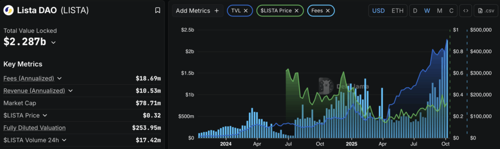 LISTA menunjukkan potensi bullish yang cukup menarik di tengah lonjakan pendapatan dan TVL platform Lista DAO dalam beberapa pekan terakhir. Pendapatan mingguan Lista DAO melesat menyentuh angka $456 ribu yang sekaligus menjadi angka pendapatan satu pekan tertinggi platform DeFi tersebut sejak diluncurkan pada 2022 lalu. Pada saat yang bersamaan, TVL platform tersebut turut mencetak rekor tertinggi barunya menyentuh angka $2,28 miliar. Sebagai salah satu platform DeFi utama di ekosistem BNB Chain, berlanjutnya tren positif BNB dapat turut mendorong meningkatnya perhatian investor terhadap LISTA di tengah pertumbuhan adopsi platform yang solid saat ini.