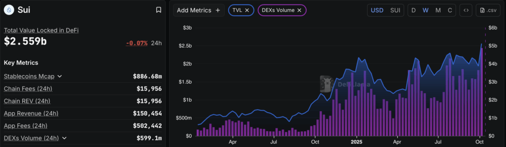 SUI menunjukkan potensi bullish yang cukup solid seiring dengan meningkatnya TVL dan volume perdagangan aset crypto di jaringan Sui dalam satu pekan terakhir. Volume perdagangan DEX di Sui dalam satu pekan terakhir menyentuh rekor tertinggi baru sepanjang masa, sejalan dengan rekor TVL yang kini telah melampaui angka $2,55 miliar. Tren positif ini berpotensi memperkuat sentimen positif terhadap token SUI serta dapat menjadi katalis positif bagi aset crypto tersebut dalam waktu dekat.