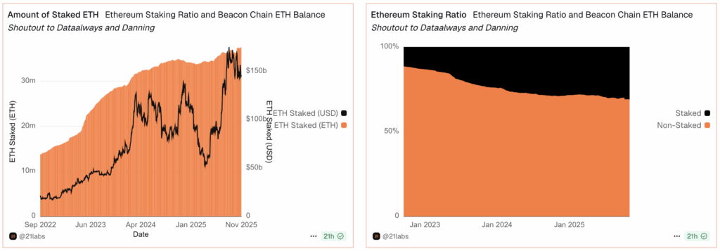 ETH menunjukkan potensi bullish seiring dengan masih terlihat solidnya minat investor terhadap staking ETH terlepas dari pelemahan harga yang terjadi dalam beberapa pekan terakhir. Jumlah ETH yang bersirkulasi memang masih didominasi oleh ETH yang tidak distaking, namun proporsi ETH yang distaking mengalami peningkatan yang konsisten dalam beberapa pekan terakhir. Di sisi lain, tingkat inflasi ETH mengacu data ultrasound.money masih berada di angka 0,6% secara tahunan tanpa peningkatan signifikan, terlepas dari pelemahan pendapatan rata-rata secara keseluruhan. Ini mengindikasikan kepercayaan diri investor terhadap prospek ke depan ETH yang masih kuat yang dapat mendukung potensi recovery harga dari kondisi saat ini.