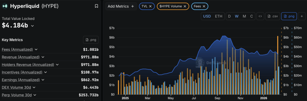 HYPE memiliki potensi yang menarik di tengah dinamika pasar saat ini. Posisi Hyperliquid sebagai platform perdagangan derivative yang memungkinkan trader untuk mengambil posisi short di tengah volatilitas pasar yang tinggi membuat adopsi Hyperliquid meningkat signifikan. Ini dapat dilihat dari tren pendapatan (fees) Hyperliquid yang konsisten meningkat dan dalam satu pekan terakhir membukukan angka $29,4 juta, naik dari pekan sebelumnya di $25,1 juta. Meningkatnya peluang di pasar derivatif terlihat memberikan dampak positif terhadap Hyperliquid sebagai pemimpin di dalam niche tersebut. Volume perdagangan HYPE juga turut meningkat signifikan meskipun TVL Hyperliquid masih relatif stagnan.