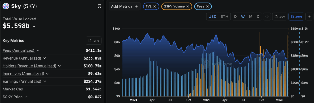 SKY menunjukkan stabilitas performa yang cukup menyita perhatian di tengah tekanan pasar yang ada saat ini. Posisi platform DeFi Sky yang terhubung dengan ekosistem aset dunia nyata termasuk aset-aset berbasis dolar AS menjadi pembeda yang signifikan dari aset/proyek crypto lain, khususnya pada situasi yang ada saat ini. Potensi berlanjutnya penguatan dolar yang dapat memberikan tekanan lanjutan pada pasar crypto secara umum dapat menjaga tren pendapatan Sky, membuatnya semakin terlihat oleh para investor yang mencari aset crypto strategis di kondisi pasar yang tidak menentu. Dalam satu pekan terakhir, peningkatan volume perdagangan token SKY yang signifikan di saat harganya naik 11% turut menyoroti optimisme trader dan investor terhadap token SKY pada kondisi pasar saat ini.