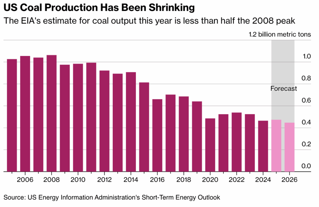 Badan Energi AS (EIA) memperkirakan konsumsi batubara nasional akan mencapai 398 juta ton metrik pada 2025, naik sekitar 7% dari tahun sebelumnya — kenaikan pertama sejak 2021.
