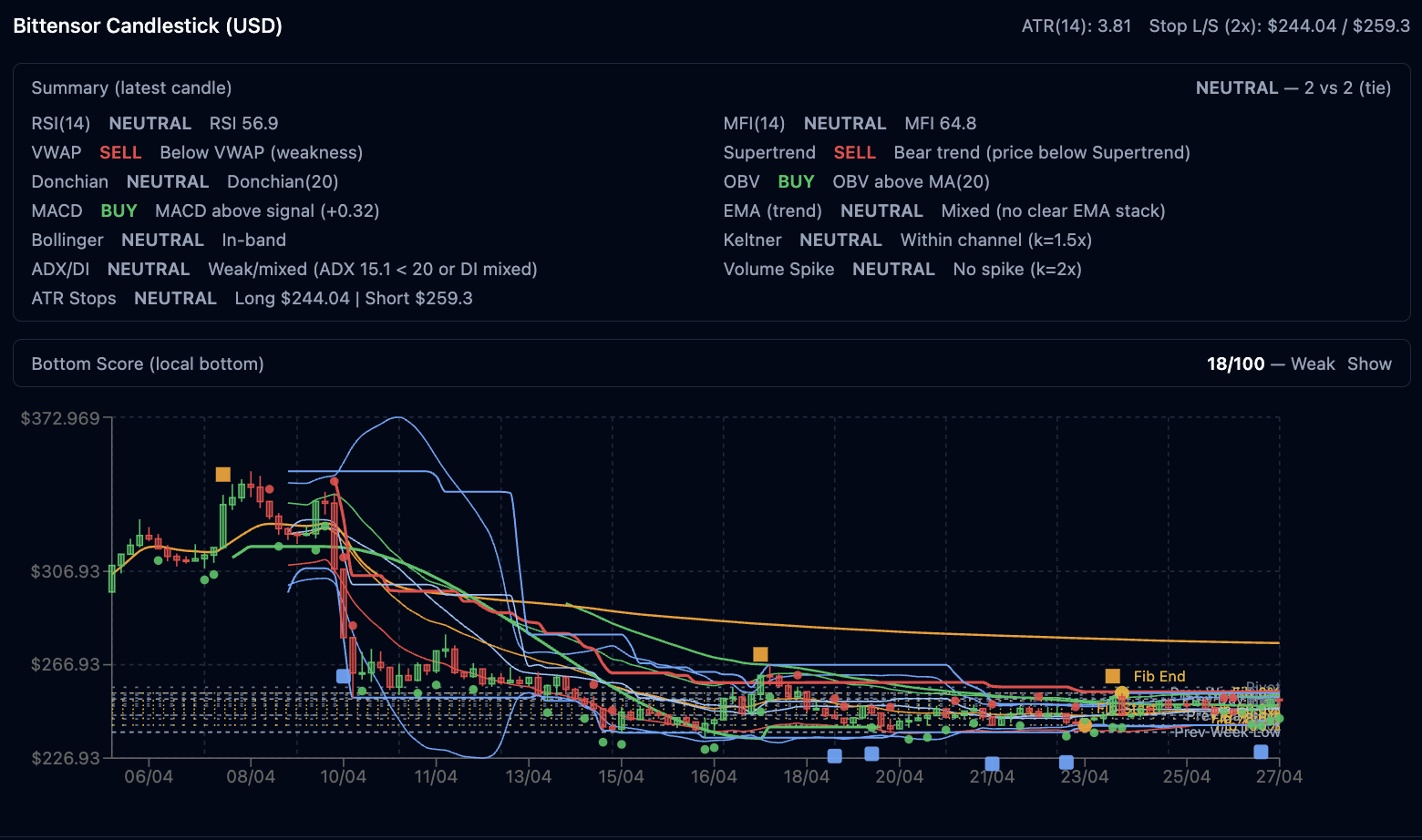 Sinyal NEUTRAL (2 vs 2 tie). MACD dan OBV memberikan dukungan BUY, namun VWAP dan Supertrend menunjukkan bear trend dengan harga di bawah level penting. EMA mixed dan bottom score rendah mengindikasikan fase konsolidasi pasca penurunan tajam di awal April.