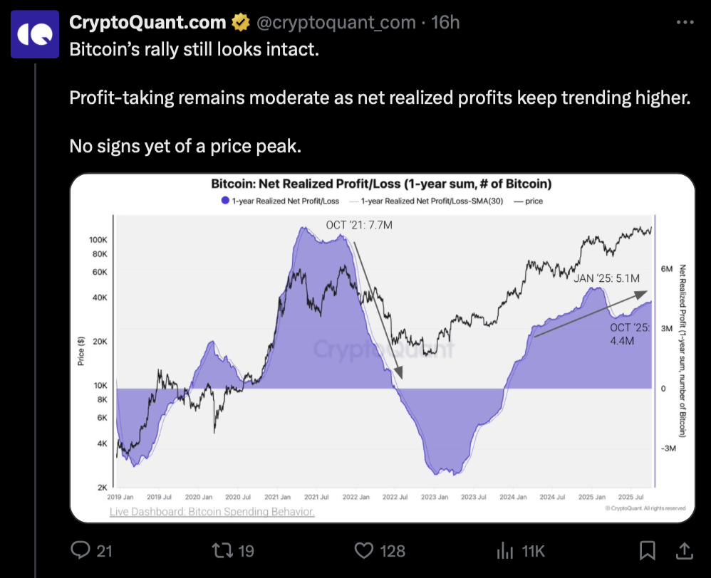 Di saat harga Bitcoin menembus rekor baru di atas $125.000, data on-chain menunjukkan sesuatu yang menarik: hampir tak ada aksi profit taking besar-besaran. Laporan terbaru CryptoQuant menegaskan bahwa profit taking masih jauh di bawah puncak historis, menandakan pasar belum berada di fase euforia akhir.