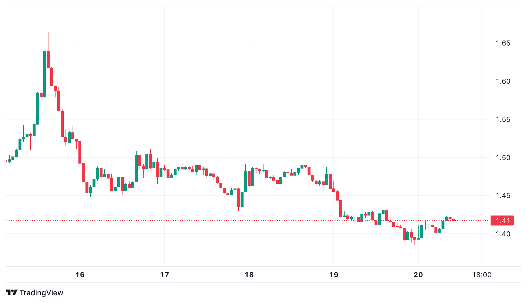 - Target potensial jangka pendek berada di $1.70, yang menjadi resistance penting high-timeframe. Jika harga berhasil tutup stabil di atas $1.50–$1.60 dengan volume mendukung, momentum bisa berbalik ke recovery lebih kuat.