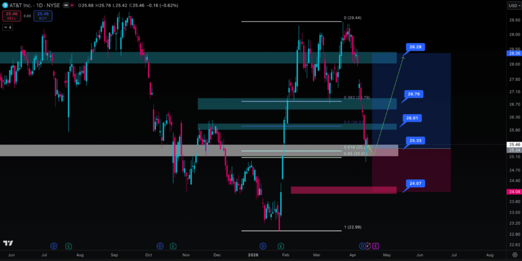 Tidak banyak saham large-cap yang menawarkan dividend yield 4.3% sekaligus setup teknikal oversold di saat bersamaan. AT&T (T) sedang berada di titik itu — diperdagangkan di $25.46–$25.63 pada 15 April 2026, dengan RSI yang sudah masuk zona ekstrem dan Q1 2026 earnings di depan mata pada 22 April.