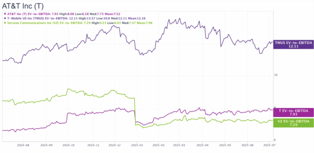 Trailing P/E AT&T saat ini berada di sekitar 8.4x, dengan forward P/E ~11x. Untuk konteks: ini bukan angka yang mencerminkan bisnis yang sedang tumbuh pesat — tapi juga bukan angka yang mencerminkan bisnis yang bermasalah. Ini angka yang lebih cocok untuk perusahaan yang pasar anggap tidak menarik, padahal aliran kasnya stabil dan konsisten.