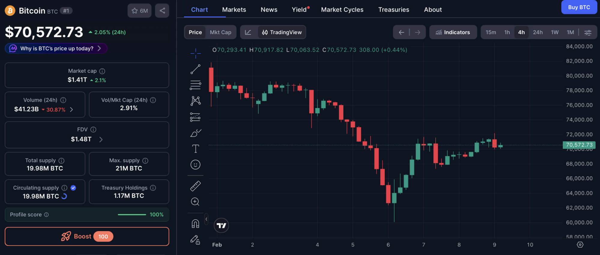 Tapi tiba-tiba, BTC snap-back keras: naik sekitar 12% dalam hitungan hari, kini bergerak di kisaran $70.000–$71.000 (per 9 Februari 2026, dengan close terbaru sekitar $70.800–$71.000 berdasarkan data Yahoo Finance dan CoinMarketCap). Rebound ini terlihat menggoda, tapi sebagai analis, saya melihat ini lebih sebagai relief rally klasik daripada sinyal bull run baru.
