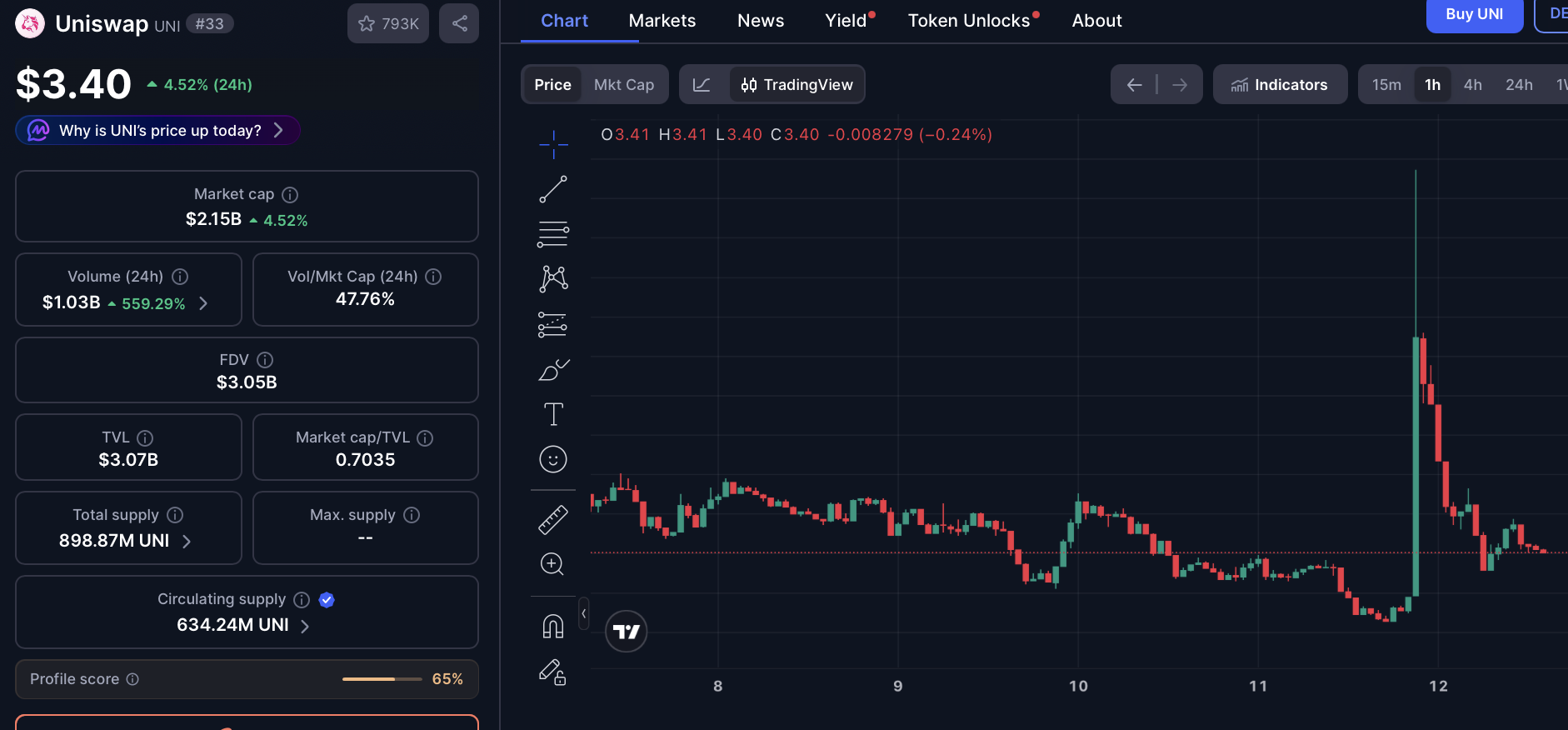 Pengumuman ini langsung memicu euforia di komunitas Uniswap. Harga UNI melonjak signifikan — laporan dari CoinDesk menyebut kenaikan hingga 25%, sementara sumber lain mencatat surge 13-40% dalam hitungan jam, dari level rendah sekitar $3 menjadi mendekati $4+ (tergantung timeframe). Volume perdagangan UNI juga meledak, menunjukkan minat tinggi dari trader dan investor.