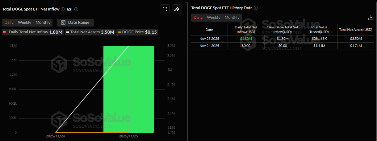 Sebagai perbandingan, ETF Dogecoin pertama di Amerika Serikat dengan eksposur Dogecoin, REX Osprey DOGE ETF (DOJE) yang diluncurkan pada September, mencatatkan volume debut $17 juta, melampaui ekspektasi analis sebesar $2,5 juta. Meskipun DOJE memiliki keterbatasan struktural (tidak dapat secara langsung memegang Dogecoin, beroperasi melalui anak perusahaan luar negeri, dan memegang saham di ETF Dogecoin Eropa/Kanada) karena diajukan di bawah Investment Company Act of 1940, peluncurannya jauh lebih kuat.