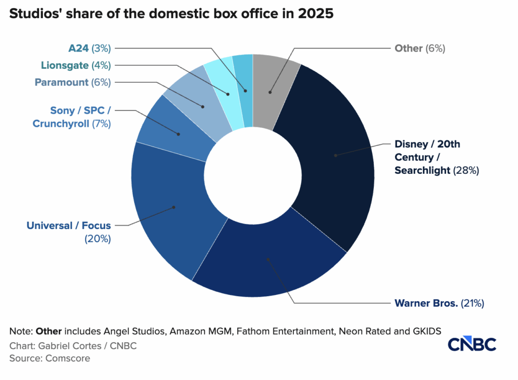 Menurut data Comscore, total penjualan tiket bioskop di AS dan Kanada mencapai US$9,05 miliar pada 2025, naik sekitar 4% dibandingkan 2024. Dari jumlah tersebut, Disney menyumbang US$2,49 miliar, atau sekitar 27,5% pangsa pasar domestik, jauh mengungguli para pesaingnya.