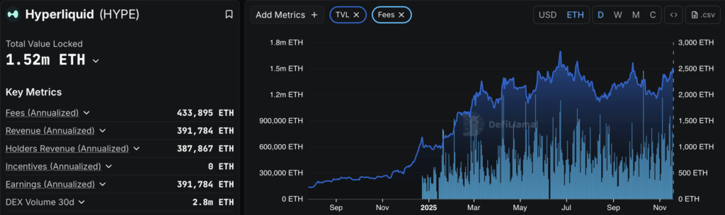 Hyperliquid terlihat masih berada pada tren adopsi yang solid terlepas dari koreksi harga yang terjadi sejak September lalu. Angka pendapatan Hyperliquid terlihat stabil dalam tiga pekan terakhir terlepas dari tekanan yang terjadi di pasar kripto, menandakan posisi strategisnya sebagai platform DeFi derivatif. Dalam beberapa hari terakhir, TVL Hyperliquid kembali melonjak, meskipun masih belum mencapai level tertingginya, ini menandakan posisi strategis Hyperliquid untuk ‘memarkir’ likuiditas investor jangka panjang. Berlanjutnya tren positif ini berpotensi dapat memberikan katalis bagi token HYPE sebagai aset kripto native di ekosistem produk Hyperliquid.