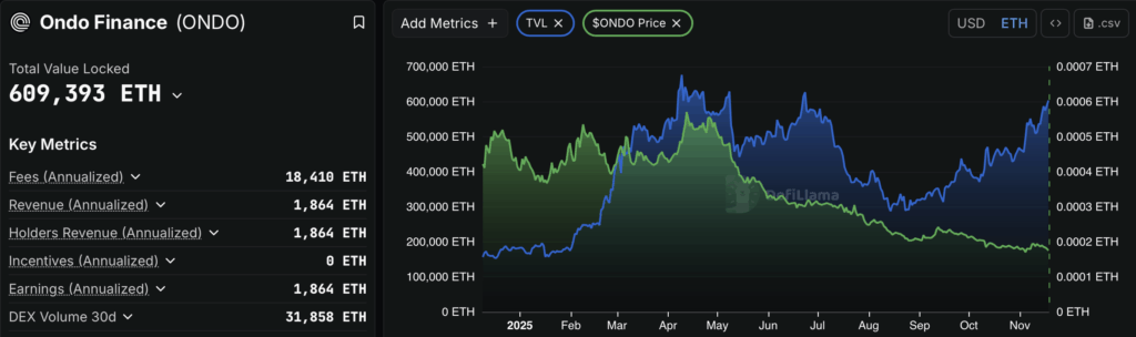 Potensi rebound ONDO khususnya untuk jangka menengah terlihat semakin solid terlepas dari koreksi harga yang masih berlanjut. Periode ini dapat mengindikasikan zona akumulasi di tengah kondisi fundamental yang solid, dan posisi Ondo Finance sebagai platform RWA yang juga bisa mendapatkan keuntungan strategis dengan menguatnya yield treasury AS. Berlanjutnya peningkatan TVL platform DeFi Ondo Finance melampaui angka $1,8 miliar terlepas dari penurunan harga aset kripto secara umum, menandakan peningkatan adopsi dan kepercayaan investor terhadap platform DeFi ini di tengah ketidakpastian pasar yang ada. Ini bisa meningkatkan atensi investor terhadap ONDO sebagai token native Ondo Finance yang dapat mendukung berkembangnya sentimen positif pada aset kripto tersebut.