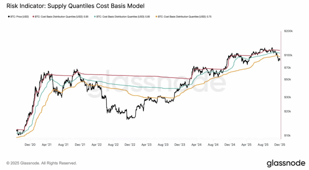 Metrik pertama yang menunjukkan stress adalah risiko kapitulasi top buyer yang tinggi. Indikator supply quantiles cost basis Glassnode, yang melacak basis biaya supply yang dipegang top buyer, menunjukkan bahwa sejak pertengahan November harga BTC telah jatuh di bawah kuantil 0,75 dan ditradingkan di dekat $96.100. Ini menempatkan lebih dari 25% supply BTC underwater.