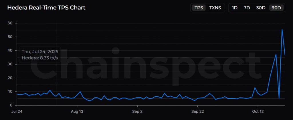 Selain itu, metrik kinerja jaringan juga menguat. Data Chainspect menunjukkan peningkatan cepat dalam Transactions Per Second (TPS) Hedera, didukung oleh ekspansi operasi DeFi, yang menggarisbawahi maturitas pasar dan ketahanan operasional Hedera Hashgraph.