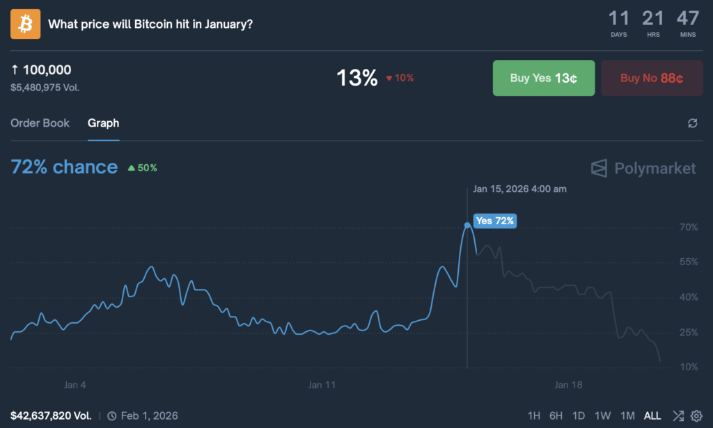 Harga Bitcoin turun dan pasar crypto lebih luas jatuh lebih dari 7% setelah Presiden Trump mengumumkan rencana tarif AS pada Denmark dan negara-negara Eropa lainnya terkait Greenland. Peluang Bitcoin naik ke $100.000 pada akhir Januari merosot di prediction market Polymarket ke angka 13% dari hampir 50% pada Jumat dan 72% pada 15 Januari.
