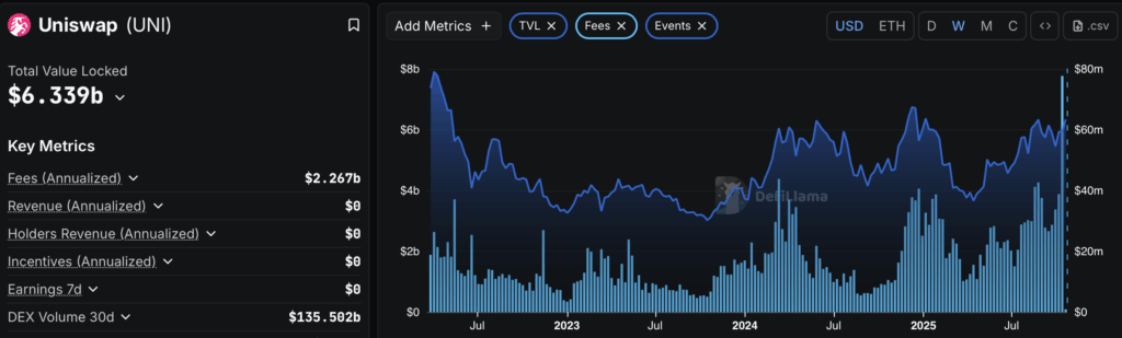 UNI menunjukkan potensi bullish yang semakin solid dengan terciptanya rekor pendapatan tertinggi baru platform DeFi Uniswap. Uniswap membukukan total pendapatan selama tujuh hari antara 6-12 Oktober sebesar $77,71 juta. Angka tersebut melampaui pendapatan sepekan tertinggi sebelumnya di $73,16 yang terjadi pada 17-23 Mei 2021 lalu. Ketika itu euforia di pasar crypto sedang tinggi-tingginya namun terjadi koreksi mendadak yang membuat harga Bitcoin turun dari $58 ribu ke $34 ribu, yang kemudian diikuti oleh reli yang membawa BTC mencetak cycle ATH pada November 2021. Harga UNI sendiri melesat dari $16,9 pada 24 Mei ke $29,3 pada 27 Mei, 2021.