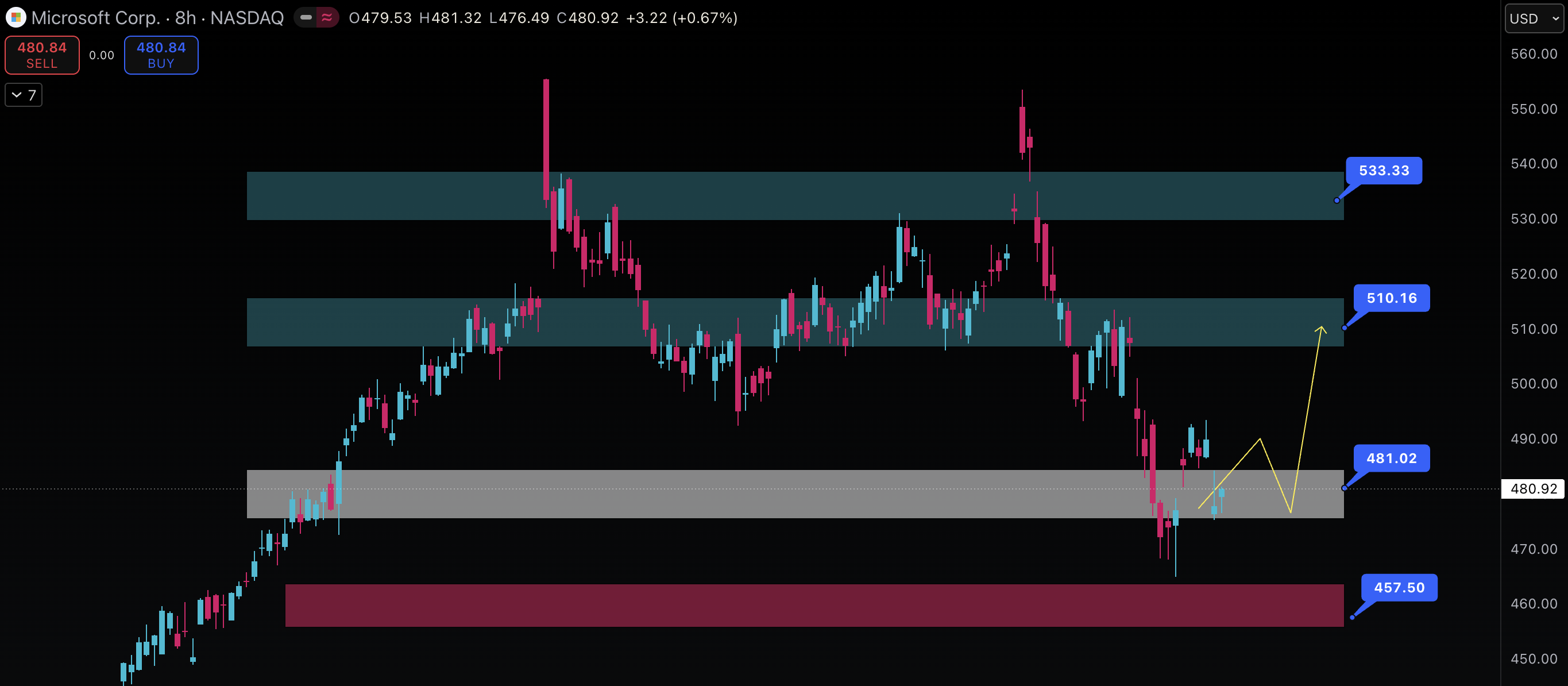 Harga MSFT saat ini telah menyentuh area support penting di kisaran $476–$480, dimana zona tersebut sebelumnya sudah berfungsi sebagai area demand jangka menengah. Candle harian menunjukkan rejection dari support tersebut — sebuah sinyal bahwa buyer mulai masuk kembali. Selama harga tetap di atas level $457 (zona invalidasi), struktur bullish masih terjaga, membuka peluang rebound ke target $510–$515 sebagai resistance defensif pertama, dan jika momentum kuat, hingga $533–$540.