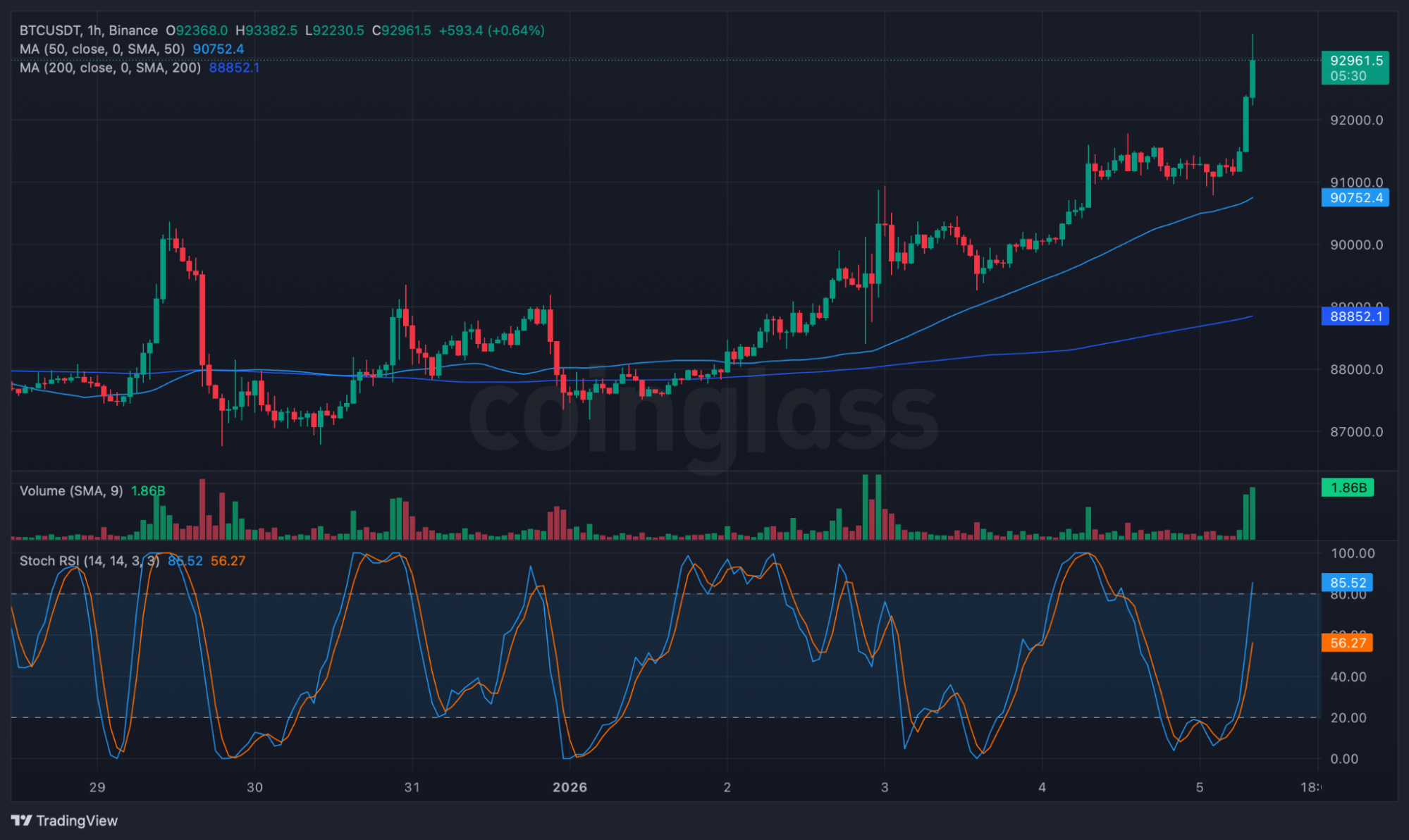 Bitcoin, aset kripto terbesar berdasarkan kapitalisasi pasar, mengalami pump impresif hari ini. Harga BTC naik lebih dari 2,5% dalam 24 jam terakhir, mencapai puncak di atas $93.185. Ini merupakan kelanjutan dari rebound awal 2026, di mana BTC sempat menyentuh $91.000 kemarin sebelum melanjutkan kenaikannya. Para analis menyebut bahwa perkembangan geopolitik di Venezuela, termasuk aksi AS yang memengaruhi sentimen pasar, menjadi salah satu katalis utama.