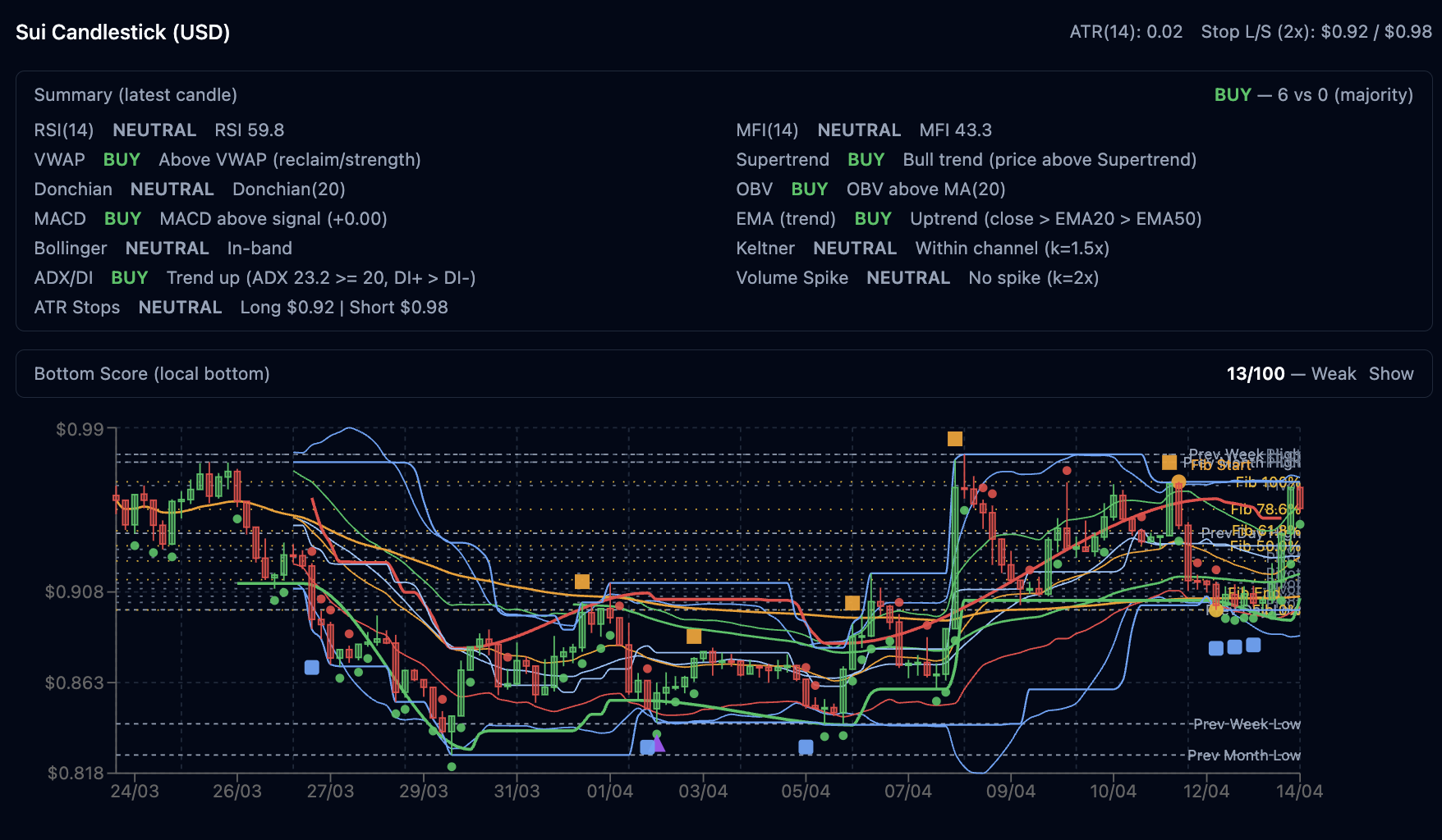 SUI saat ini diperdagangkan di sekitar $0.95 (sekitar Rp16.300.000). Indikator menunjukkan 6 BUY vs 0 SELL (mayoritas kuat). VWAP BUY, MACD BUY, ADX/DI trend up, Supertrend BUY, OBV BUY, dan EMA uptrend memberikan dukungan solid. RSI netral di 59.8, Bottom Score masih lemah (13/100), tapi harga berada di fase pemulihan di atas support penting.