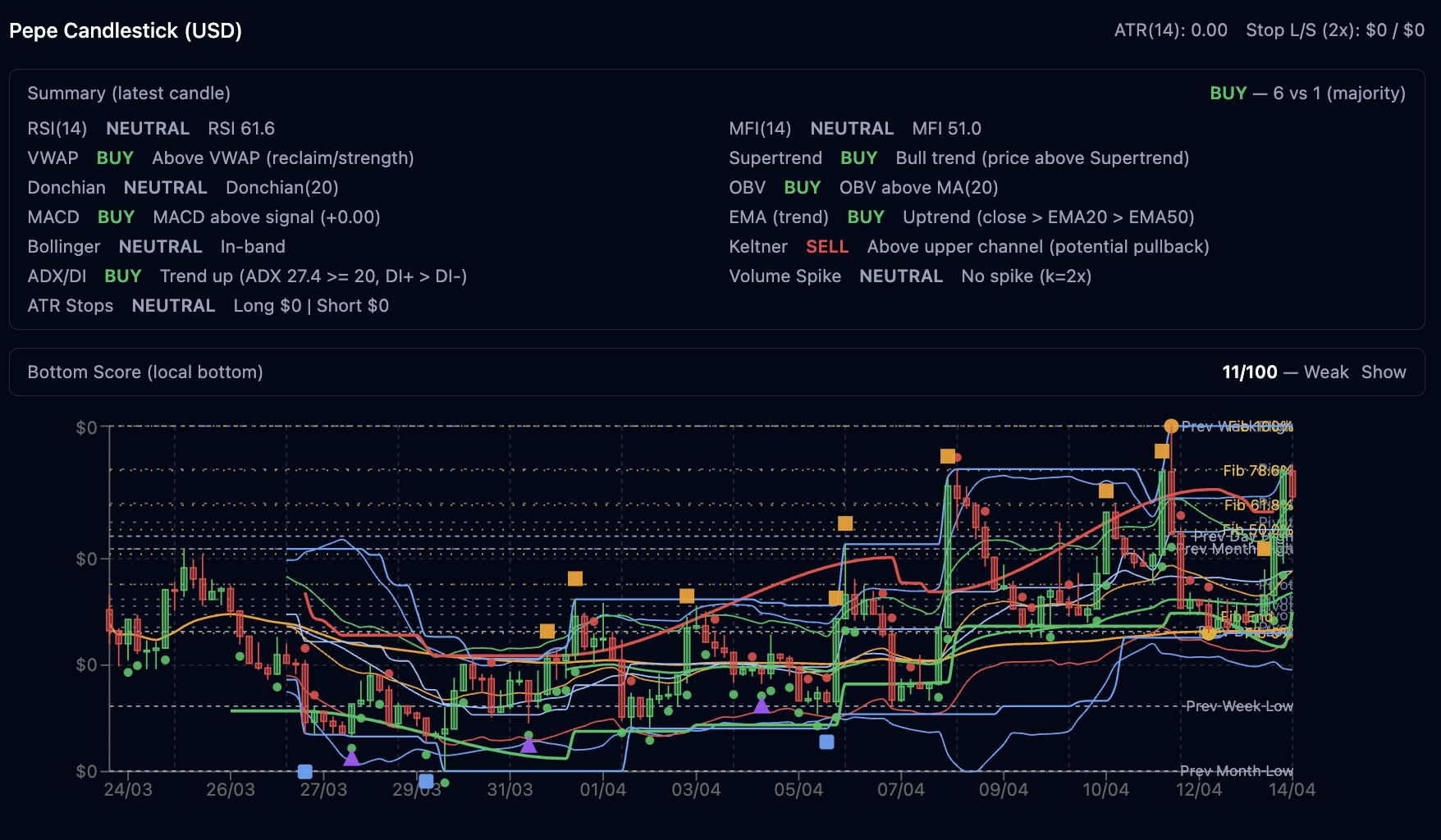 PEPE diperdagangkan di kisaran $0.00000370 (sekitar Rp63.500). Sinyal BUY 6 vs 1, didukung VWAP BUY, MACD BUY, ADX/DI BUY, Supertrend BUY, OBV BUY, dan EMA uptrend. Keltner SELL mengingatkan potensi pullback, tapi tren bull masih dominan. Bottom Score 11/100 menunjukkan belum terlalu kuat, cocok untuk trading swing.