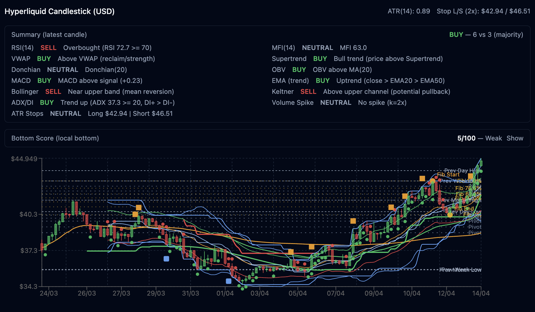 HYPE saat ini di level $44.60 (sekitar Rp765.000). Sinyal mayoritas BUY 6 vs 3. MACD BUY, ADX 37.3 (trend sangat kuat), Supertrend BUY, OBV BUY, dan EMA uptrend mendukung. Namun RSI 72.7 (overbought), Bollinger & Keltner SELL mengindikasikan risiko koreksi. Bottom Score hanya 5/100, artinya kewaspadaan tinggi diperlukan.