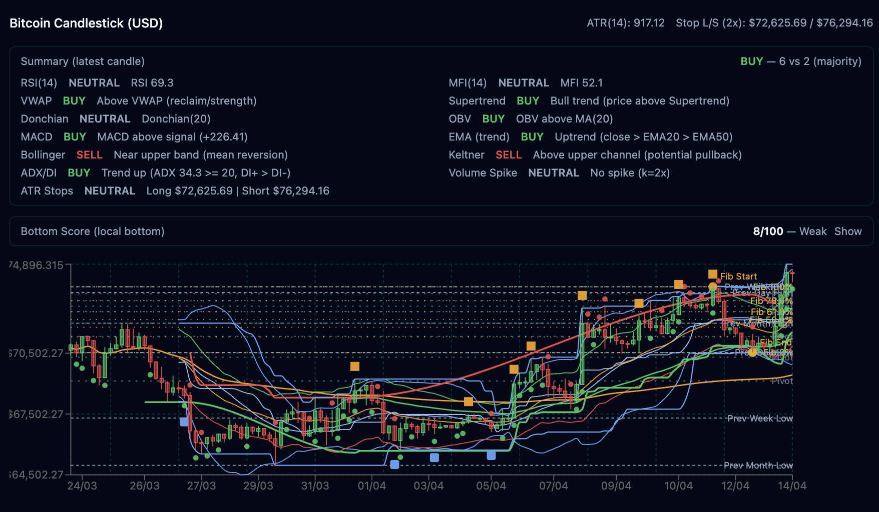 BTC berada di level $74.400 (sekitar Rp1.276.000.000). Sinyal mayoritas BUY 6 vs 2. MACD BUY kuat, ADX 34.3 (trend up jelas), Supertrend BUY, OBV BUY, dan EMA uptrend menjadi pondasi. Namun Bollinger dan Keltner SELL karena harga mendekati upper band/channel, RSI 69.3 mendekati overbought. Bottom Score lemah (8/100) menandakan potensi koreksi sebelum lanjut naik.