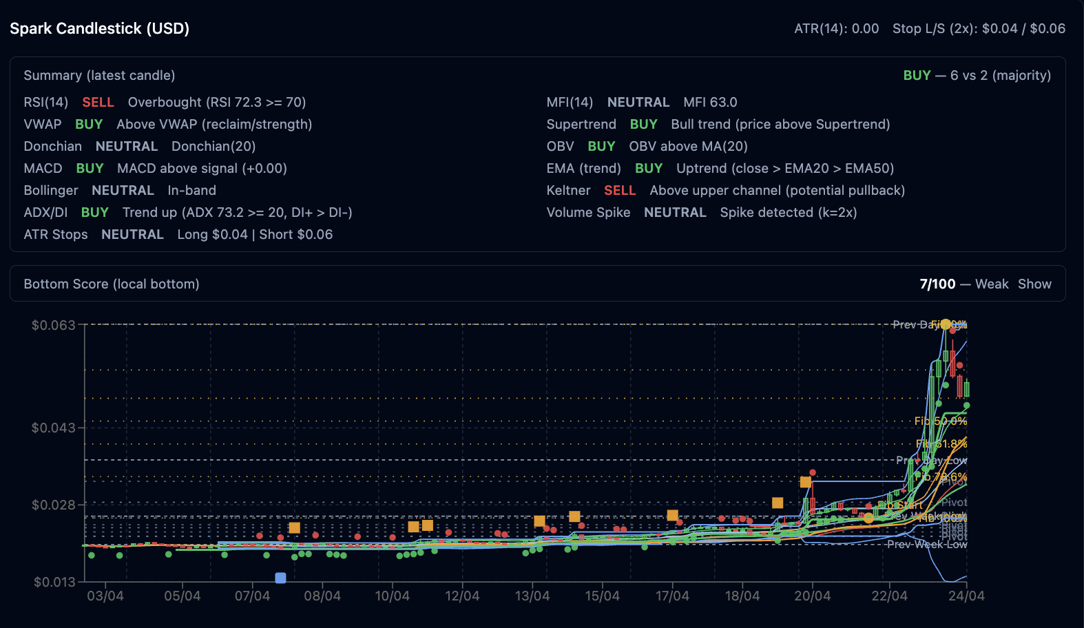 Chart harian menampilkan uptrend kuat dengan harga di atas Supertrend, EMA20 > EMA50, VWAP reclaim, OBV BUY, dan ADX/DI sangat tinggi (73.2). MACD BUY serta EMA trend BUY mendukung bullish, meski RSI(14) SELL (overbought 72.3) dan Keltner SELL (di atas upper channel) memberi peringatan potensi pullback jangka pendek. Bottom Score 7/100 (Weak Show) dan volume spike terdeteksi menandakan momentum tinggi tapi perlu kehati-hatian. Mayoritas sinyal tetap BUY (6 vs 2).
