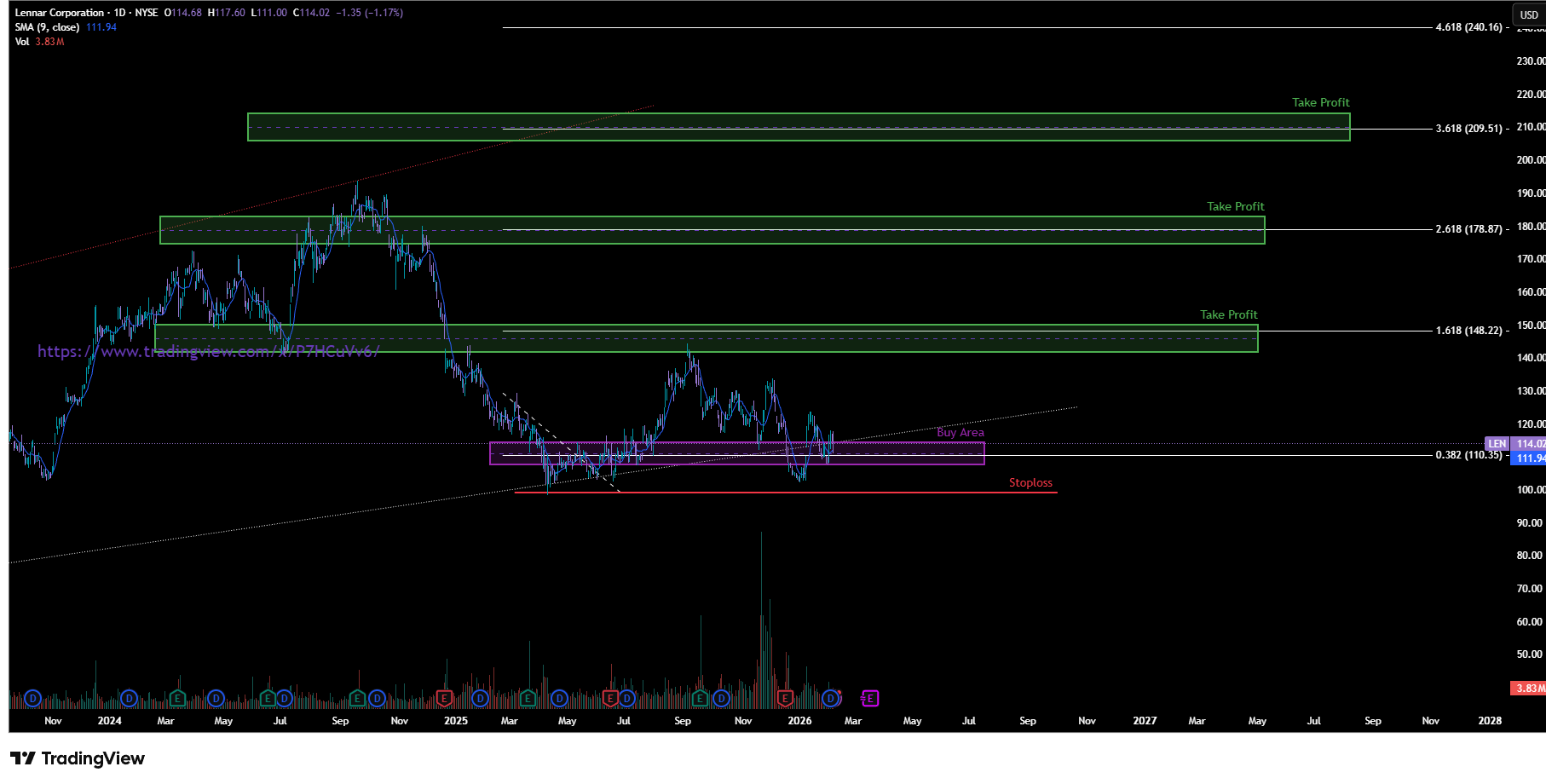 LEN sedang berada di zona akumulasi strategis $108–114, area historis penting yang berulang kali menjadi titik rejection downside. Secara teknikal, peluang rebound menuju $148 → $178 → $205 terbuka dengan risk yang terukur. Dikombinasikan dengan perbaikan sentimen sektor dan aksi harga yang stabil, LEN menarik untuk swing trade hingga position trade konservatif, terutama di tengah ketidakpastian makro sektor perumahan.