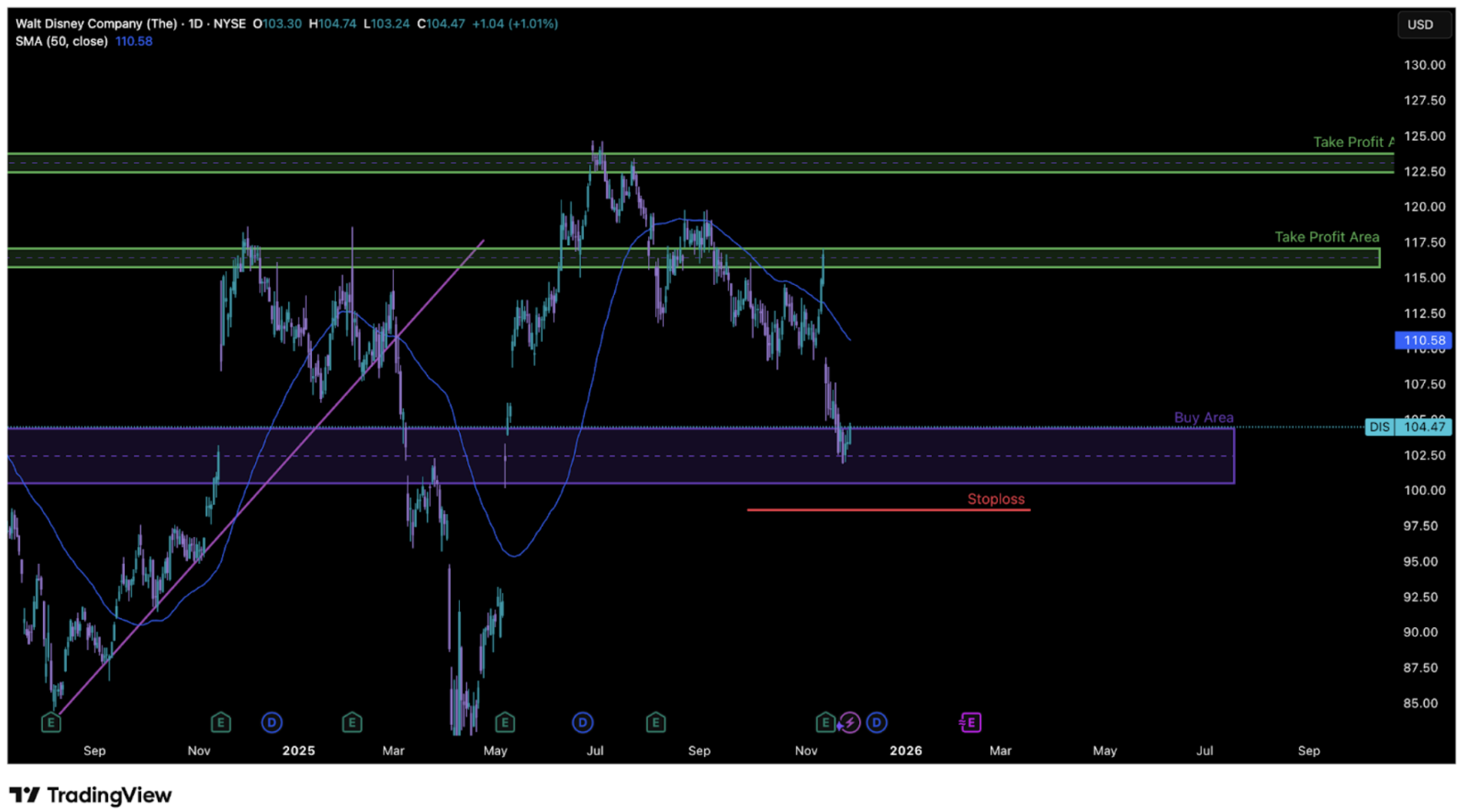 TP1 berada di area $113–116, yaitu zona resistance / supply terdekat serta mendekati garis MA50 yang kini menjadi dynamic resistance. Jika harga mampu break area tersebut, potensi melanjutkan rally menuju TP2 di $122–125 terbuka lebar—zona supply besar yang sebelumnya menahan rally panjang Disney beberapa bulan terakhir.