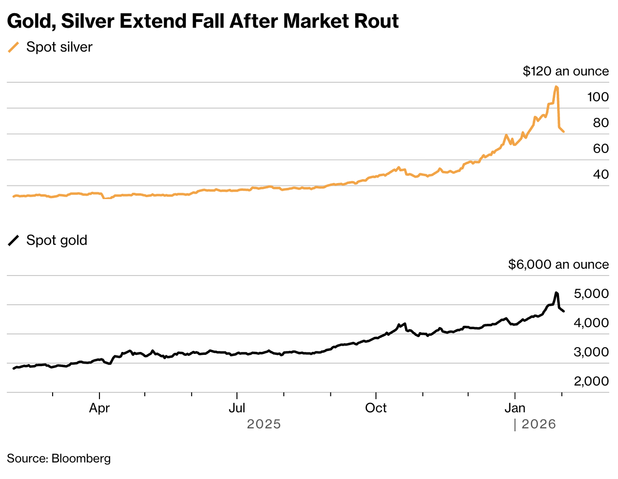 Spot silver sempat anjlok hampir 16% intraday, sebelum akhirnya memangkas penurunan menjadi sekitar 5–6%. Skala koreksi ini menegaskan kembali reputasi silver sebagai “devil’s metal” — pasar kecil, likuiditas tipis, dan sangat rentan terhadap aksi leverage. Dalam kondisi pasar yang sudah terlalu “crowded”, silver menjadi titik lemah pertama yang runtuh.