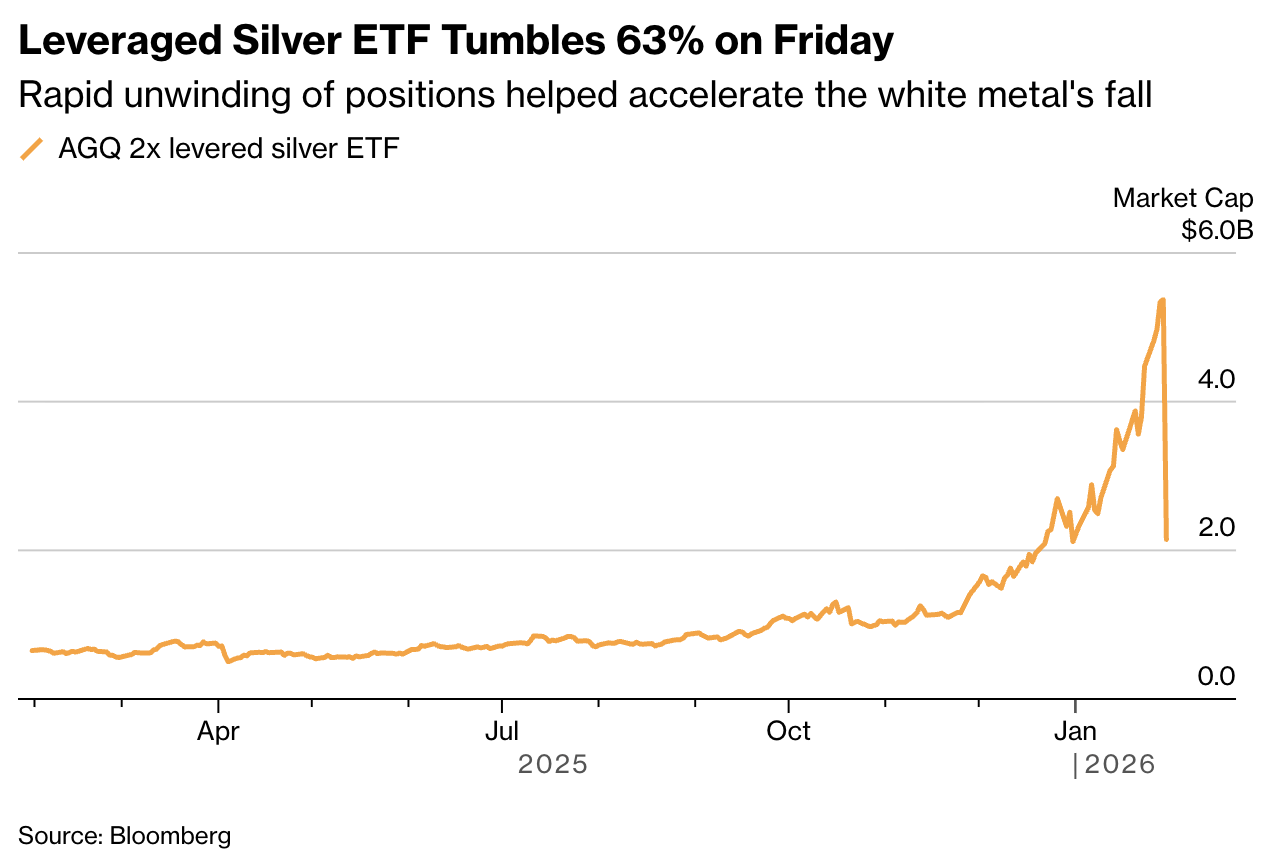 ETF leveraged seperti ProShares Ultra Silver (AGQ) terpaksa melakukan rebalancing besar-besaran. Menurut estimasi pasar, rebalancing ini memicu sekitar US$4 miliar penjualan kontrak silver futures, mempercepat spiral penurunan harga. Tekanan ini secara tidak langsung ikut memukul SLV, karena penurunan harga spot mempersempit ruang stabilisasi dari investor jangka pendek.