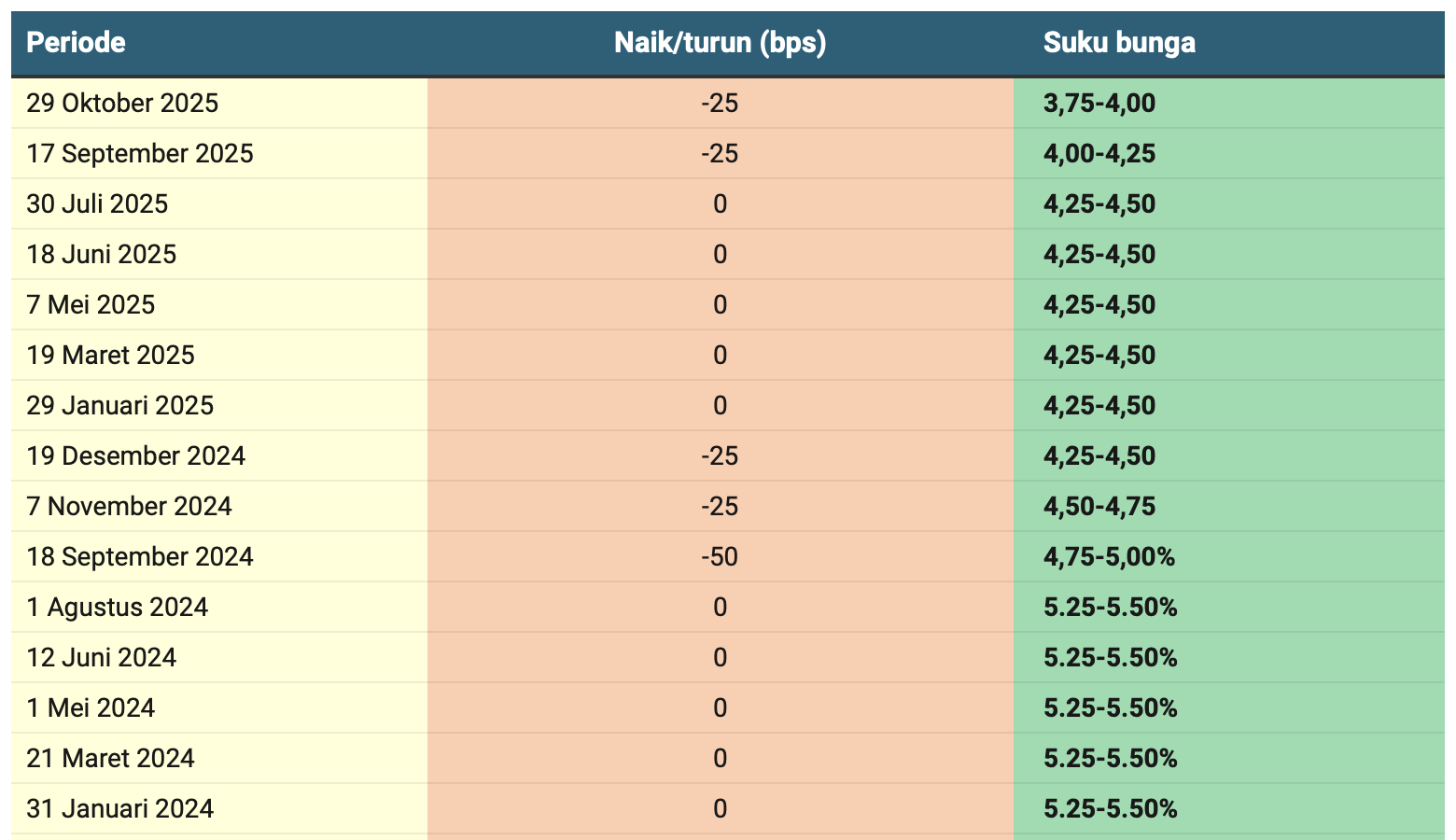 The Fed telah berada dalam siklus pengetatan moneter sejak 2022 untuk menekan inflasi yang melonjak pasca-pandemi. Namun, sepanjang 2025, tanda-tanda perlambatan ekonomi mulai muncul: tingkat pengangguran naik menjadi 4,3% dari 4% di awal tahun, penciptaan lapangan kerja melambat, dan pertumbuhan GDP terancam oleh shutdown pemerintah yang berkepanjangan. Inflasi memang masih di atas target 2%, tetapi prioritas The Fed bergeser ke perlindungan pasar tenaga kerja.