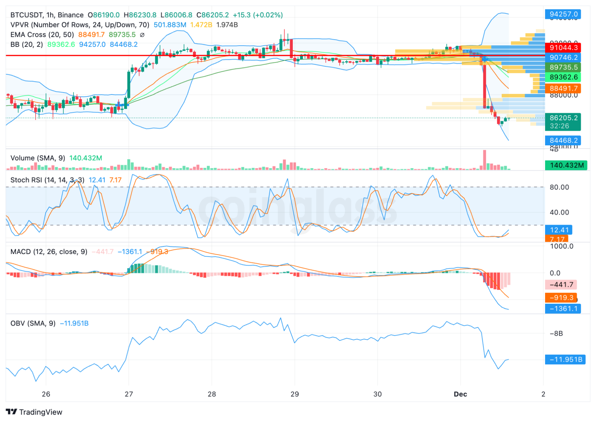 • Pola Chart: Bearish flag menarget $80.400 jika konfirmasi break down. Namun, pola double bottom di $80.000 bisa flip ke bullish, targeting $105.000 – $108.000 akhir Desember.