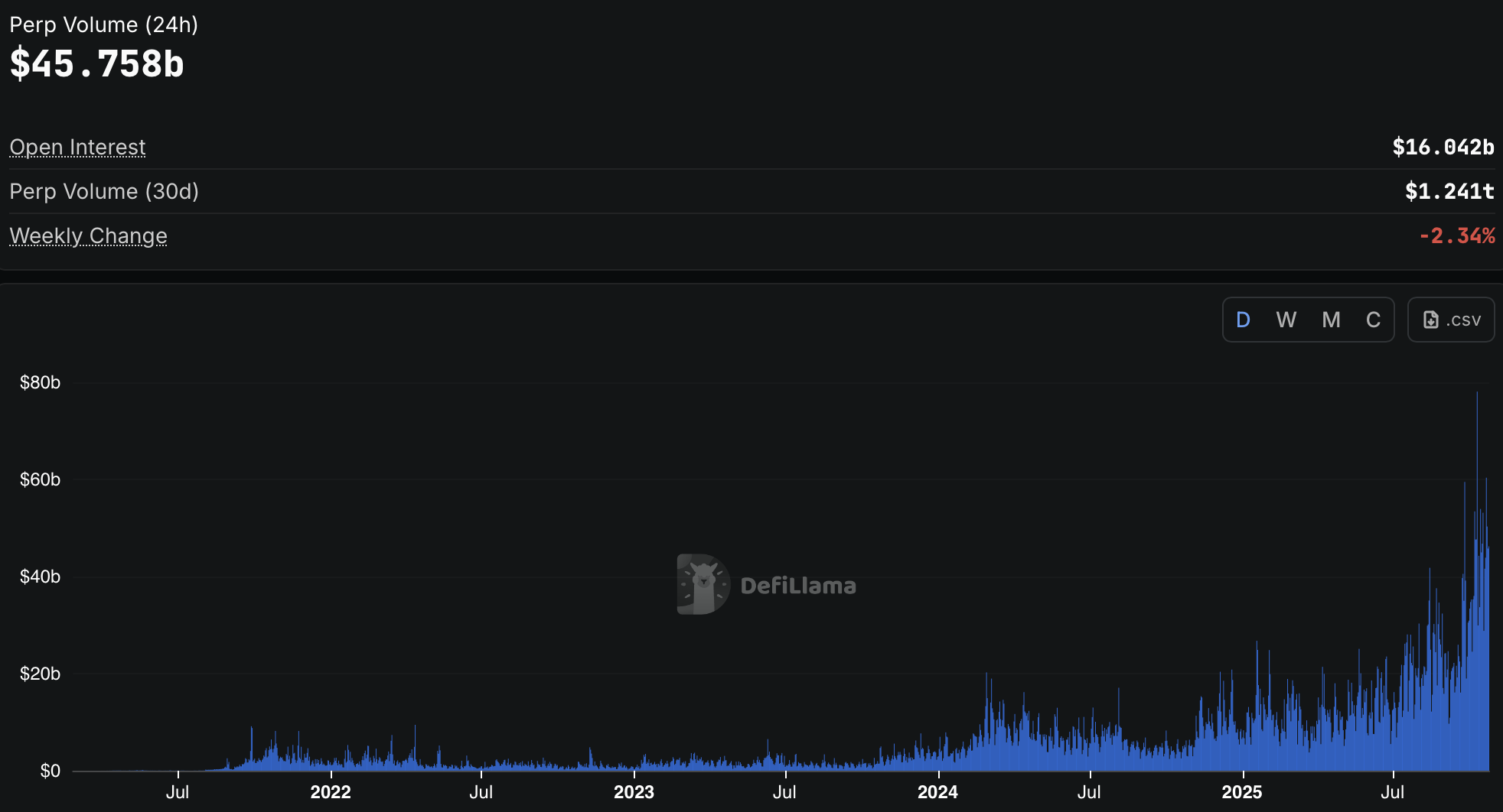 Bulan Oktober 2025 menjadi titik balik bagi perdagangan derivatif terdesentralisasi. Menurut DeFiLlama, volume perdagangan kontrak perpetual DeFi melampaui $1 triliun, melonjak dari $762 miliar di Agustus. Dengan proyeksi mencapai $1,3 triliun hingga akhir bulan, pertumbuhan ini menunjukkan kepercayaan trader terhadap platform DeFi.