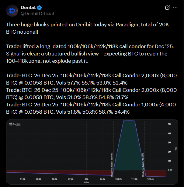 2. Taruhan Stabilitas: Sebaliknya, mereka bertaruh bahwa harga Bitcoin akan stabil dan bertahan dalam kisaran harga yang spesifik (antara $100.000 hingga $118.000) hingga kontrak opsi mereka berakhir pada Desember 2025.