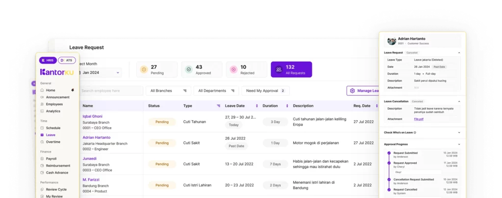 - Sinkronisasi dengan payroll dan absensi, setiap cuti tercatat otomatis dalam sistem gaji dan absensi.
