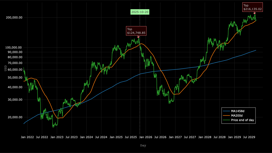 • Timing rata-rata: 1.060 hari dari low siklus (sekarang hari ke-1.000+), menempatkan puncak Oktober–November 2025.