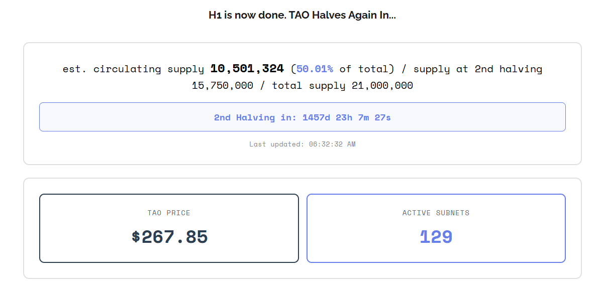 Halving ini dipicu ketika total pasokan mencapai 10,5 juta TAO (setengah dari maksimum 21 juta TAO). Mekanisme ini mirip Bitcoin, tapi Bittensor menggunakan trigger berbasis jumlah token yang sudah diterbitkan, bukan jumlah blok tetap.