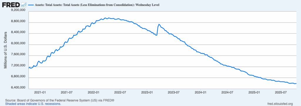 Pemangkasan suku bunga oleh The Fed belum diikuti oleh perluasan neraca (balance sheet expansion). Data FRED menunjukkan total aset bank sentral (WALCL) per 16 Oktober 2025 tercatat $6,59 triliun, masih jauh di bawah puncak pandemi sekitar US$9 triliun.