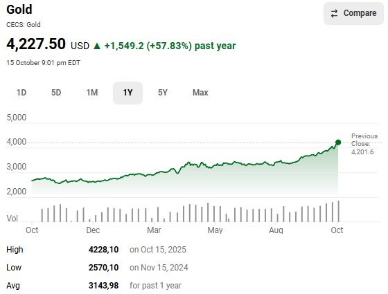 Sepanjang Oktober 2025, harga emas telah melonjak secara dramatis. Pada awal bulan, emas sempat menyentuh level USD 4.000 per ounce pada 8 Oktober, yang merupakan tonggak sejarah ke-45 untuk rekor tertinggi baru di tahun ini. Hingga 15 Oktober, harga naik menjadi USD 4.209,60 per ounce, dengan kenaikan 1,60% dalam sehari dan 14,03% dalam sebulan terakhir. Secara tahunan, emas telah mengalami peningkatan hingga 55,09% dalam satu tahun, sementara dalam enam bulan terakhir naik 24,56%.