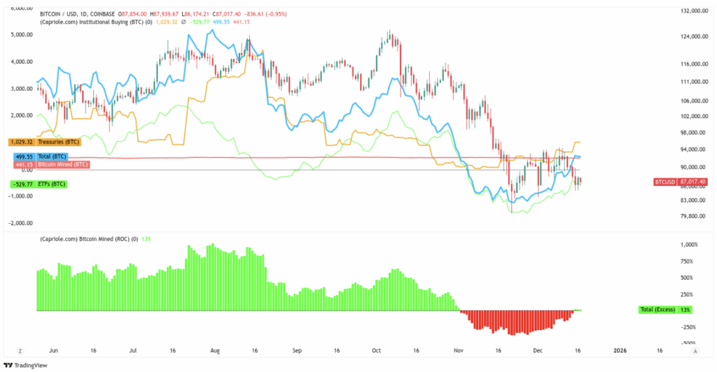 Permintaan Bitcoin dari investor institusional akhirnya melampaui supply baru untuk pertama kalinya dalam enam minggu terakhir. Data terbaru dari Capriole Investments menunjukkan institusi kini membeli 13% lebih banyak BTC dibanding jumlah yang ditambang setiap hari. Meski angkanya masih jauh di bawah puncak bull market dua bulan lalu, perubahan arah ini sangat signifikan. Bitcoin kini menjadi target institusi lagi setelah harga turun lebih dari 30% dari all-time high $126.000 di Oktober ke level terendah $80.500.