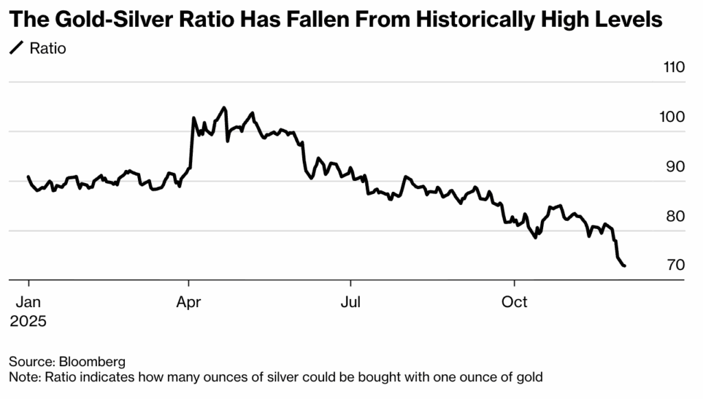 Di awal 2025, gold-silver ratio sempat menembus >100x, level yang secara historis dianggap ekstrem. Artinya, satu ounce emas bisa membeli lebih dari 100 ounce silver.