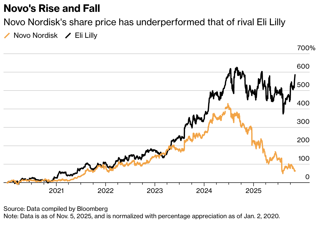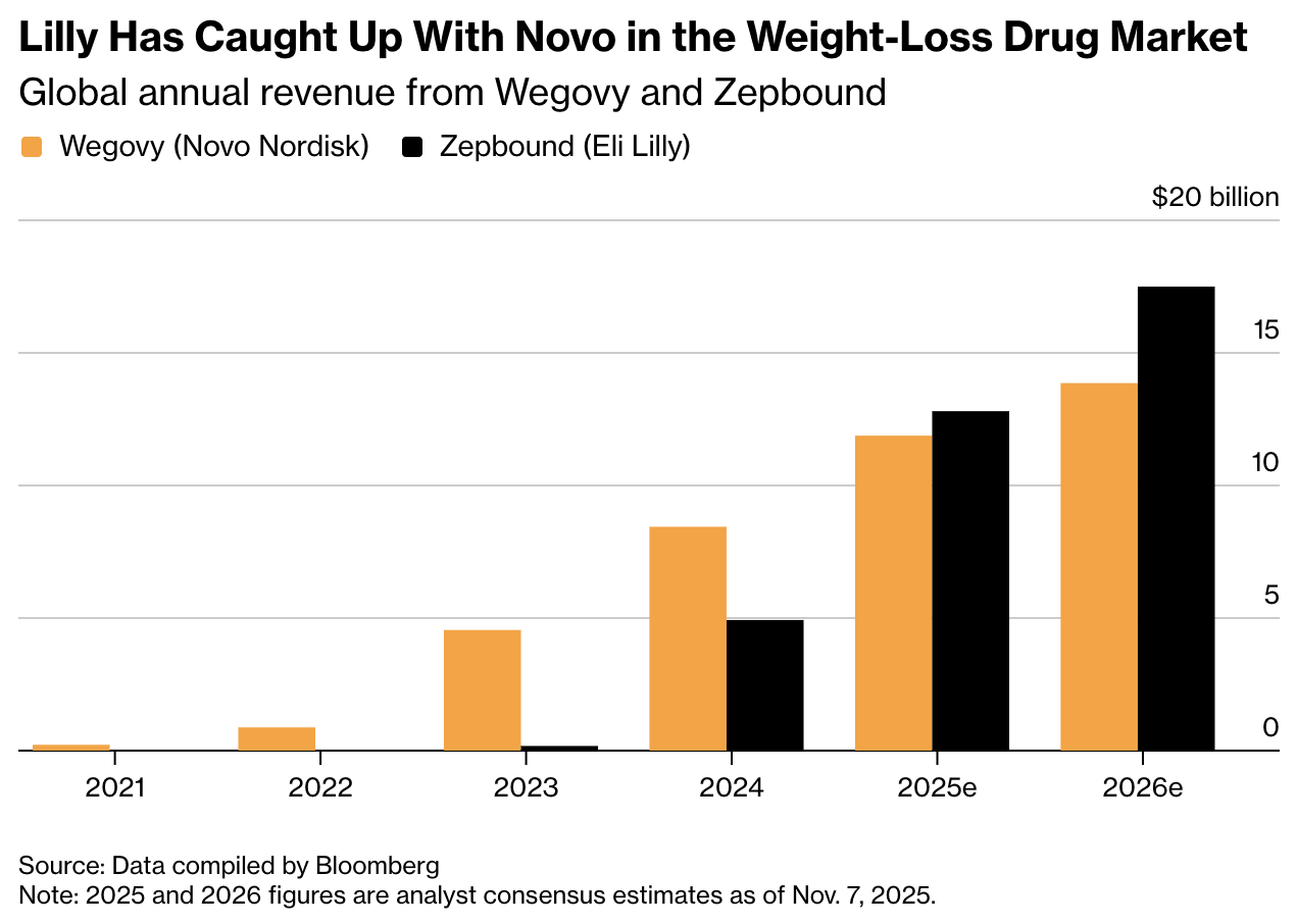 Selama beberapa tahun, penjualan Wegovy dan Ozempic melonjak pesat, membantu Novo mengatasi perlambatan di bisnis insulin dan penyakit langka. Namun, dominasi itu mulai terguncang saat Eli Lilly & Co. meluncurkan obat sejenis bernama Zepbound pada 2023. Dalam uji klinis langsung, Zepbound menunjukkan hasil penurunan berat badan yang lebih baik dibanding Wegovy. Kini, total resep untuk Zepbound telah melampaui Wegovy, dan pendapatan globalnya diperkirakan mencapai $12,8 miliar pada 2025, lebih tinggi dari proyeksi Wegovy di $11,9 miliar.