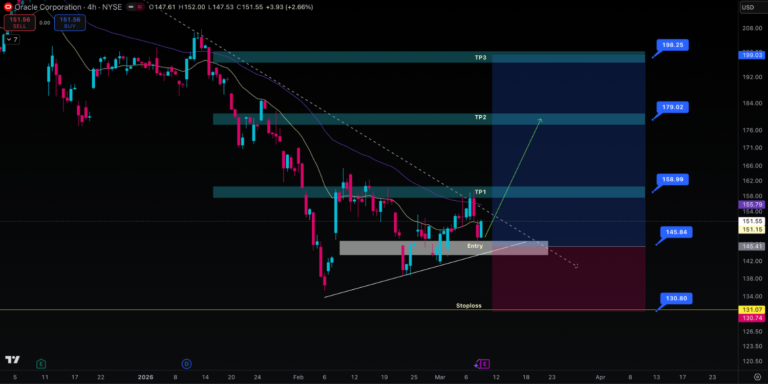 Menariknya, cerita fundamental ini mulai selaras dengan setup teknikal di chart, setelah berbulan-bulan berada dalam tekanan, harga saham Oracle mulai menunjukkan potensi pembalikan arah.