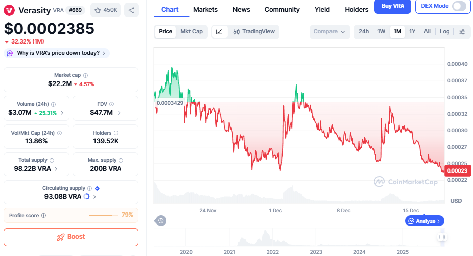 Saat ini (Desember 2025), harga VRA berada di sekitar $0.00024 – $0.000245 USD, dengan market cap sekitar $22-24 juta dan ranking di luar top 600 di CoinMarketCap. Harga ini mengalami penurunan signifikan dalam beberapa bulan terakhir, dipengaruhi oleh kondisi pasar crypto secara keseluruhan yang bearish.