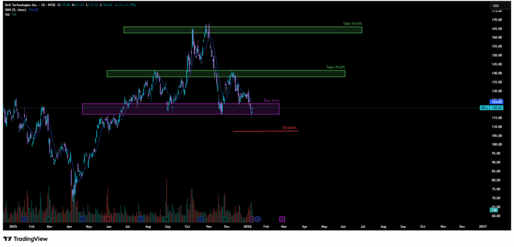 Harga DELL saat ini berada di area $118–122, yang merupakan former resistance kuat (mid-2025) dan kini berfungsi sebagai support/demand zone penting. Area ini juga menjadi base konsolidasi sebelum reli sebelumnya menuju $160+.